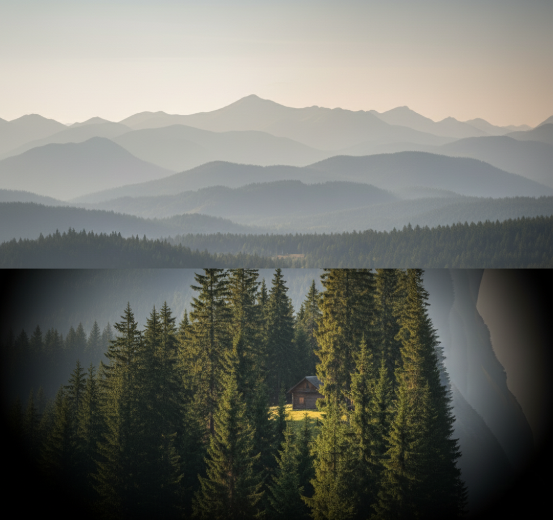 Chaque texture, chaque mouvement lointain devient clair et détaillé : la silhouette d’un animal à flanc de montagne, une voile à l’horizon, un sommet lointain sous le soleil couchant.
